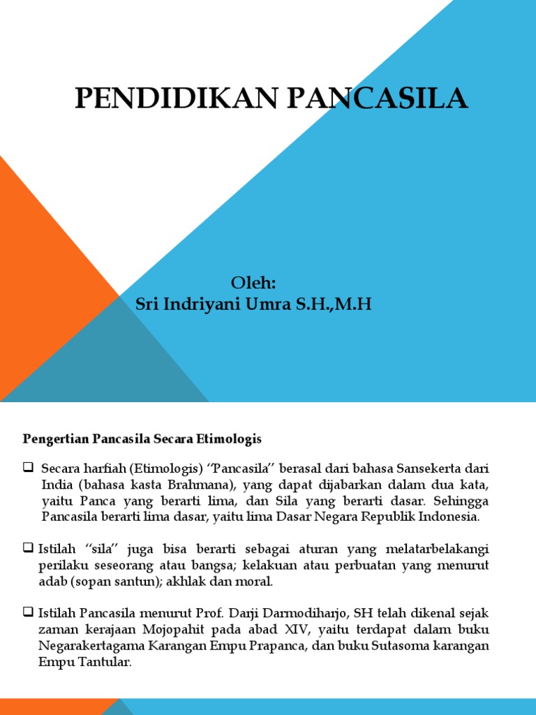 Setiap warga Indonesia wajib paham mengenai Pancasila baik pengertian tujuan fungsi lambang makna dan sejarahnya. BAB I PENDAHULUAN ii A. BAB I PENDAHULUAN 11 LATAR BELAKANG Secara etimologis istilah Pancasila itu berasal dari bahasa Sansekerta dari India.